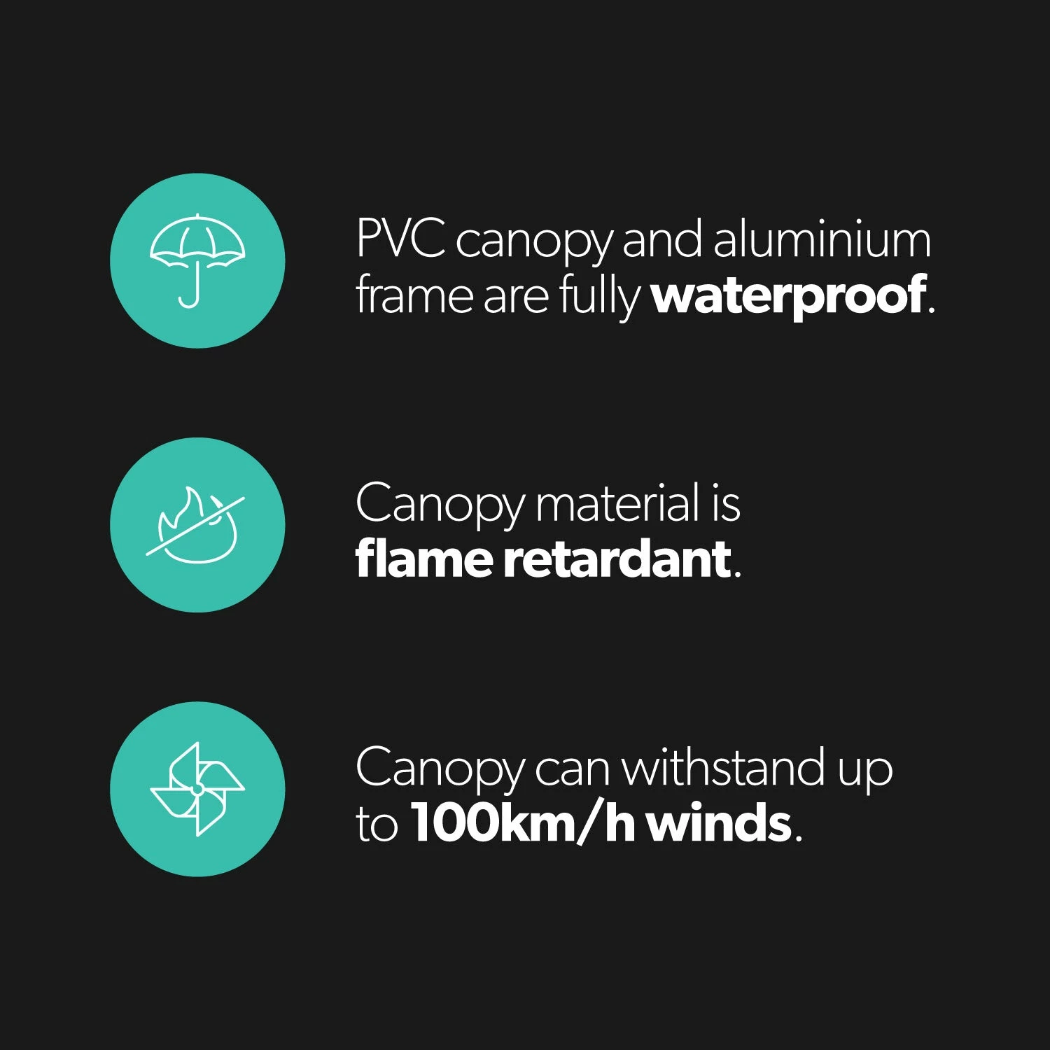 - Made from waterproof and flame-retardant materials that can withstand up to 100km/h winds
