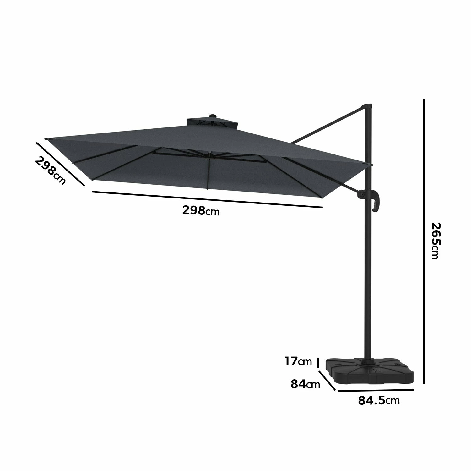 Make a stylish addition to your garden with this cantilever parasol. The canopy can be rotated 360⁰ with the foot peddle, plus it can be tilted and height adjusted thanks to the crank mechanism, so you can enjoy the outdoors whilst keeping yourself protected. Built with a sturdy frame structure, it’ll make a durable addition to your garden this summer. With water-resistant fabric, it’ll also withstand a light rain shower. The weighted base that is included can be filled with water, giving your parasol even more stability.