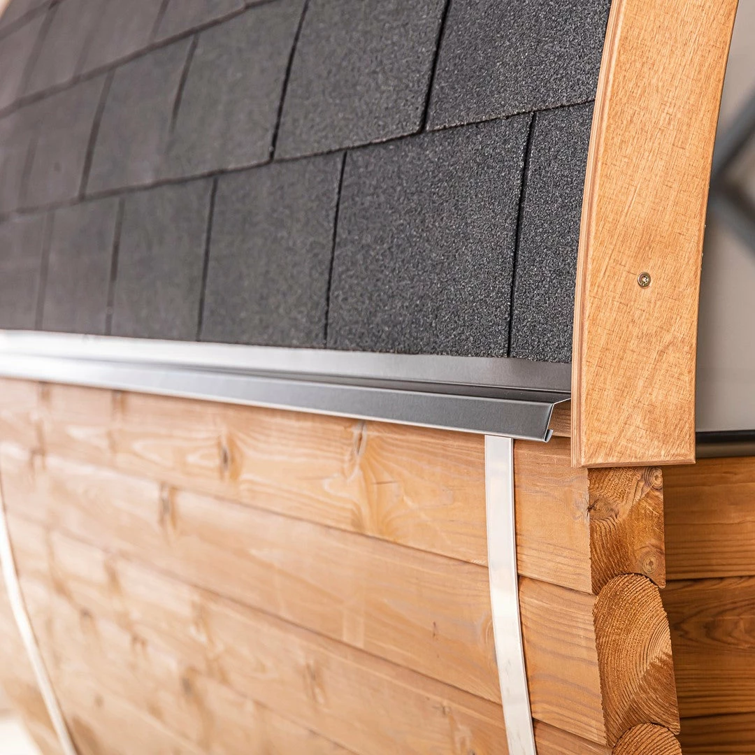 Traditional barrel design provides structural integrity and minimal maintenance, with the curved build naturally shedding water and snow. Roof shingles act as protective shields from the elements, ensuring lower energy bills and a potential bump in your property’s value. Barrel saunas also provide an extra layer of efficiency, less power is needed to heat the room due to minimal unused airspace, while the thick staves are excellent insulators.