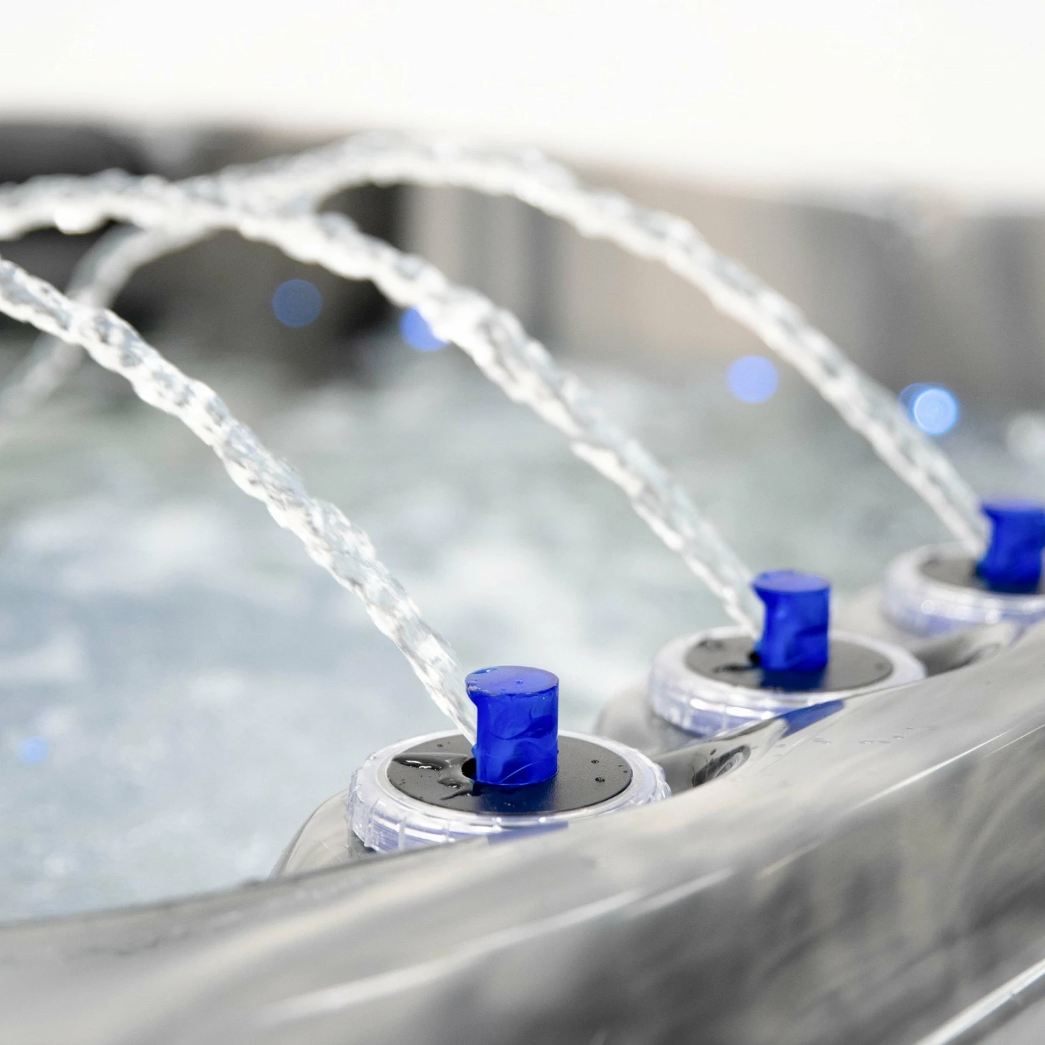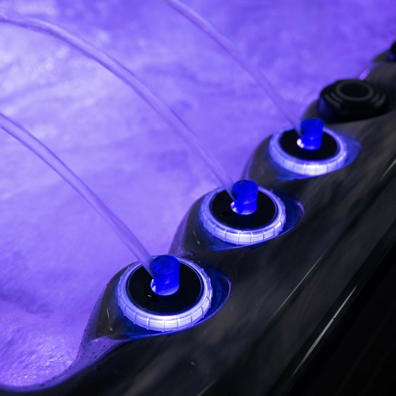 49 rotating and directional jets have been placed in a specific formation for various muscle groups in each seat so you can focus on key areas to suit your needs. There’s even a selection of diverters placed around your hot tub to give you complete control of pressure and jet selection using the control panel. The LED-backlit water fountain adds to your well-being journey.