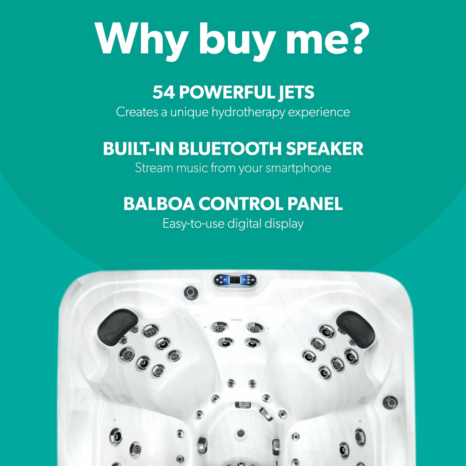 This hot tub is eye-catching, from its smooth wood effect cabinet to its glossy faux marble shell, which glistens silver and opal. However, its features and technology make it stand out, like the multi-coloured LED lighting effects inside, a built-in Bluetooth music system to get your hot tub party going and the water purification system with 2-stage skimmer filtration that removes even minor impurities. Known for its reliability, the Balboa control panel allows you to easily adjust your hot tub’s jets, filtration and temperature to music and lighting. There’s even an economy and sleep mode to help you save energy.